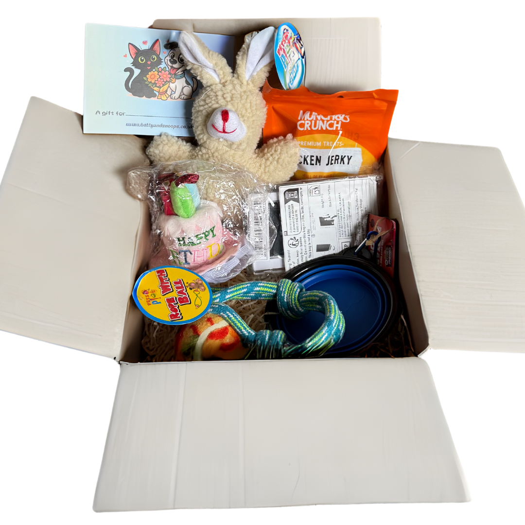 Celebrate a special pup’s big day with tail-wagging joy! This birthday box is bursting with delicious treats, playful toys, and festive surprises to make any dog feel extra loved. Whether they're a zoomie-loving youngster or a dignified senior, this gift brings the party right to their paws!