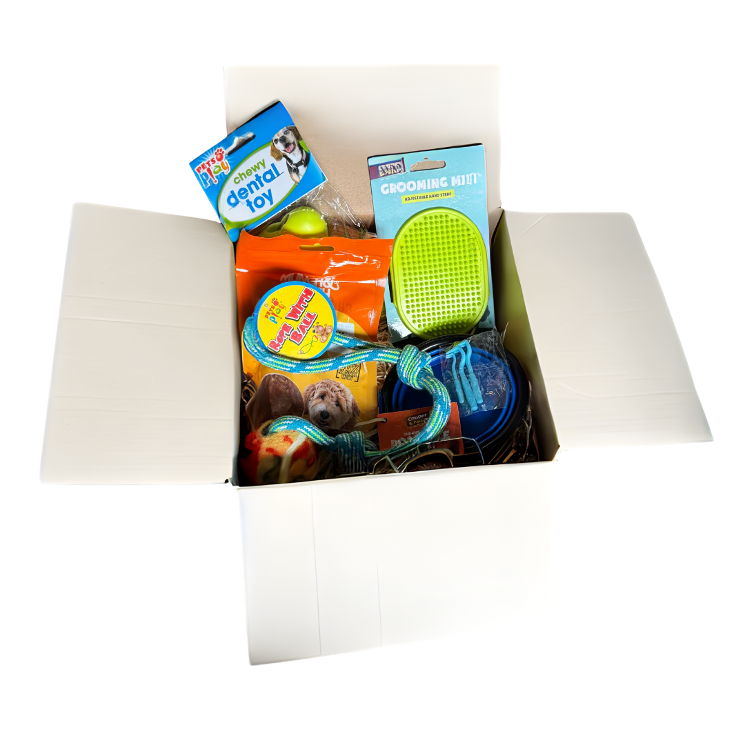 Our Welcome to Your New Home dog gift box is packed with seven practical and playful goodies to help pups settle in and feel right at home.